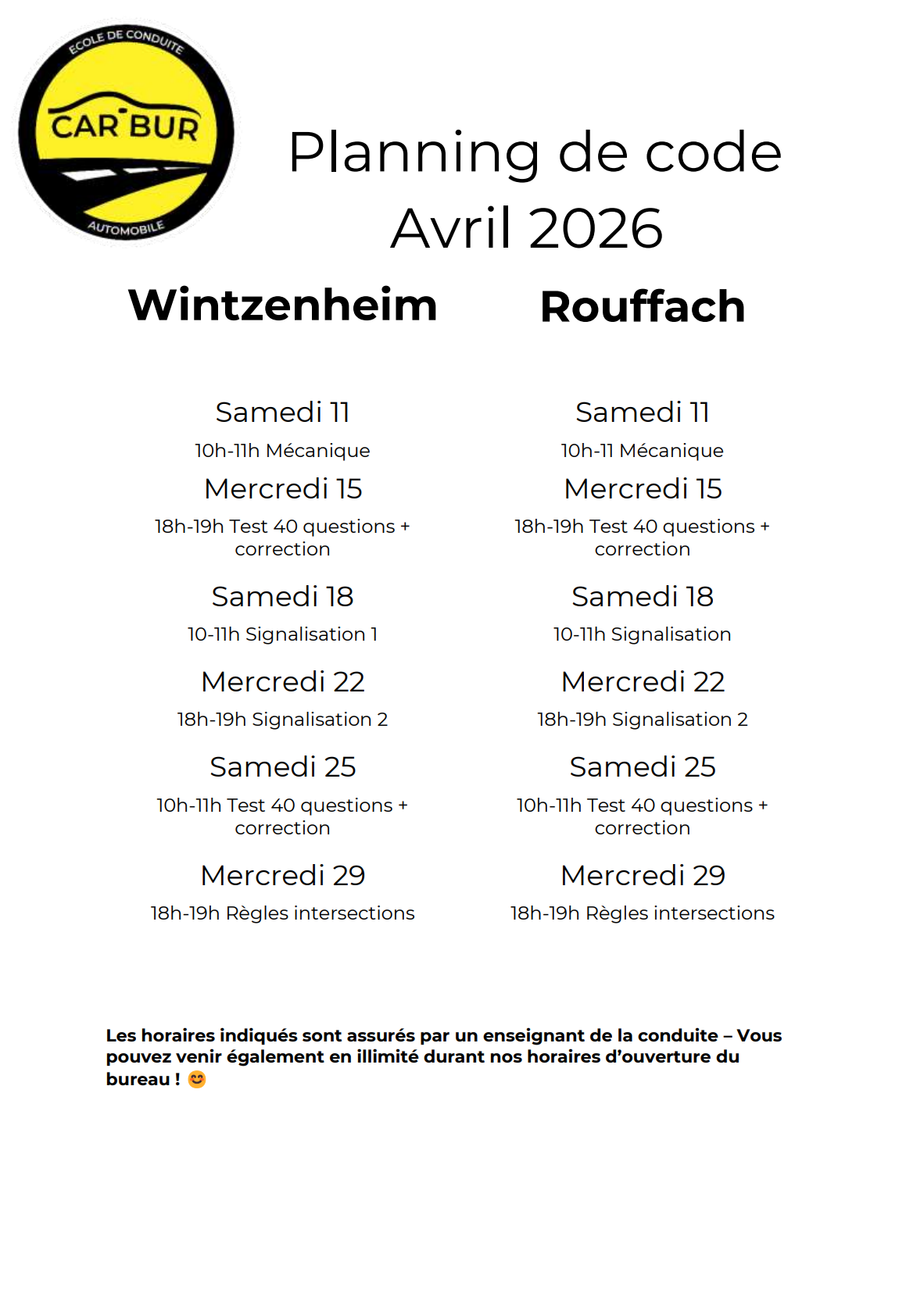 Retrouvez ici le planning détaillé des cours pour passer votre code de la route près de Colmar ! Ce planning est mis à jour de manière mensuelle. Nos moniteurs d’auto-école et le tout le personnel de notre auto-école vous attend avec grand plaisir. Venez vous entrainer et réaliser des examens blanc de code de la route ce mois-ci ! Ci-dessous, nous vous invitons à télécharger le planning de cours afin de l’avoir sur vous en toute circonstance.
